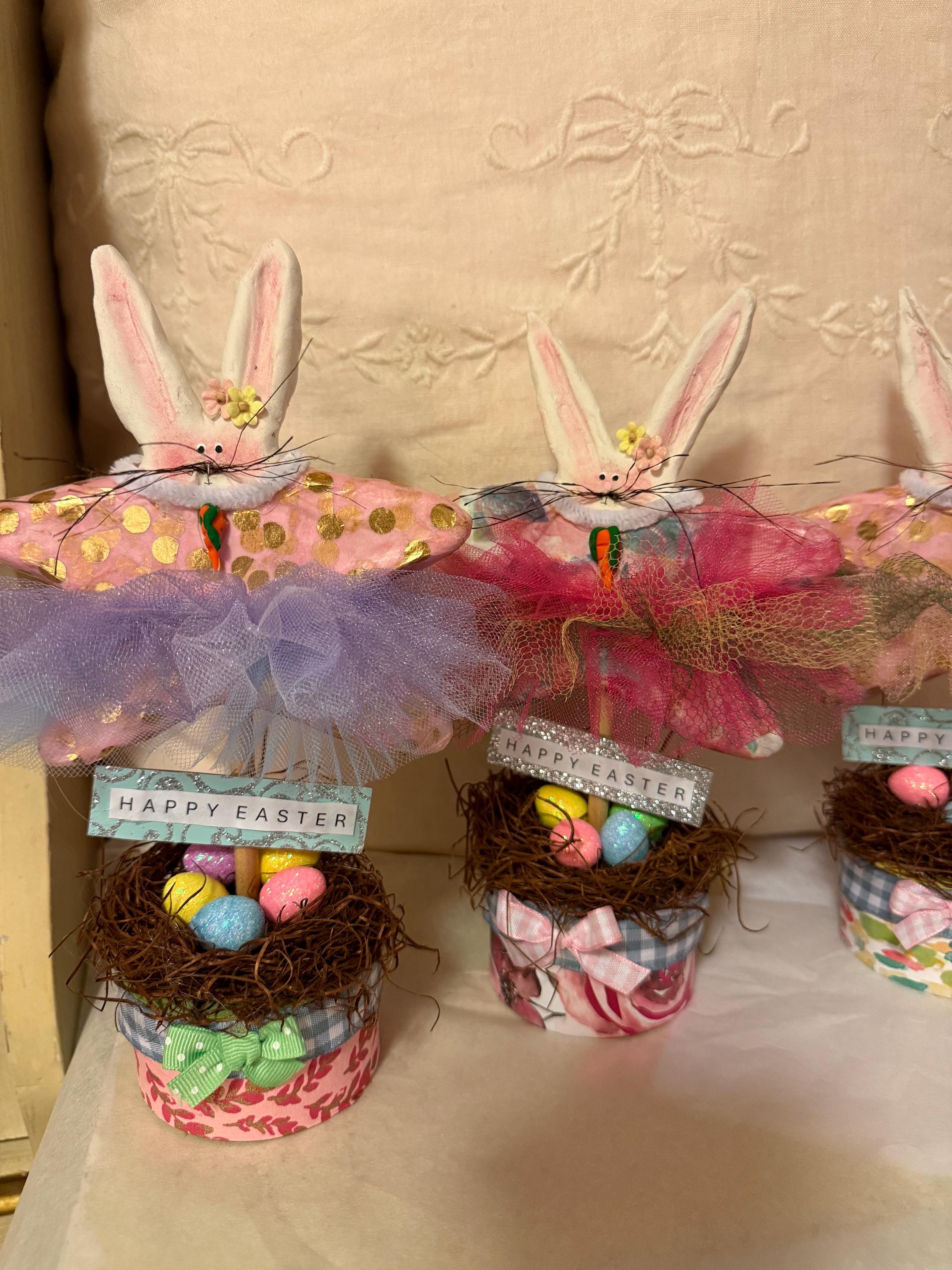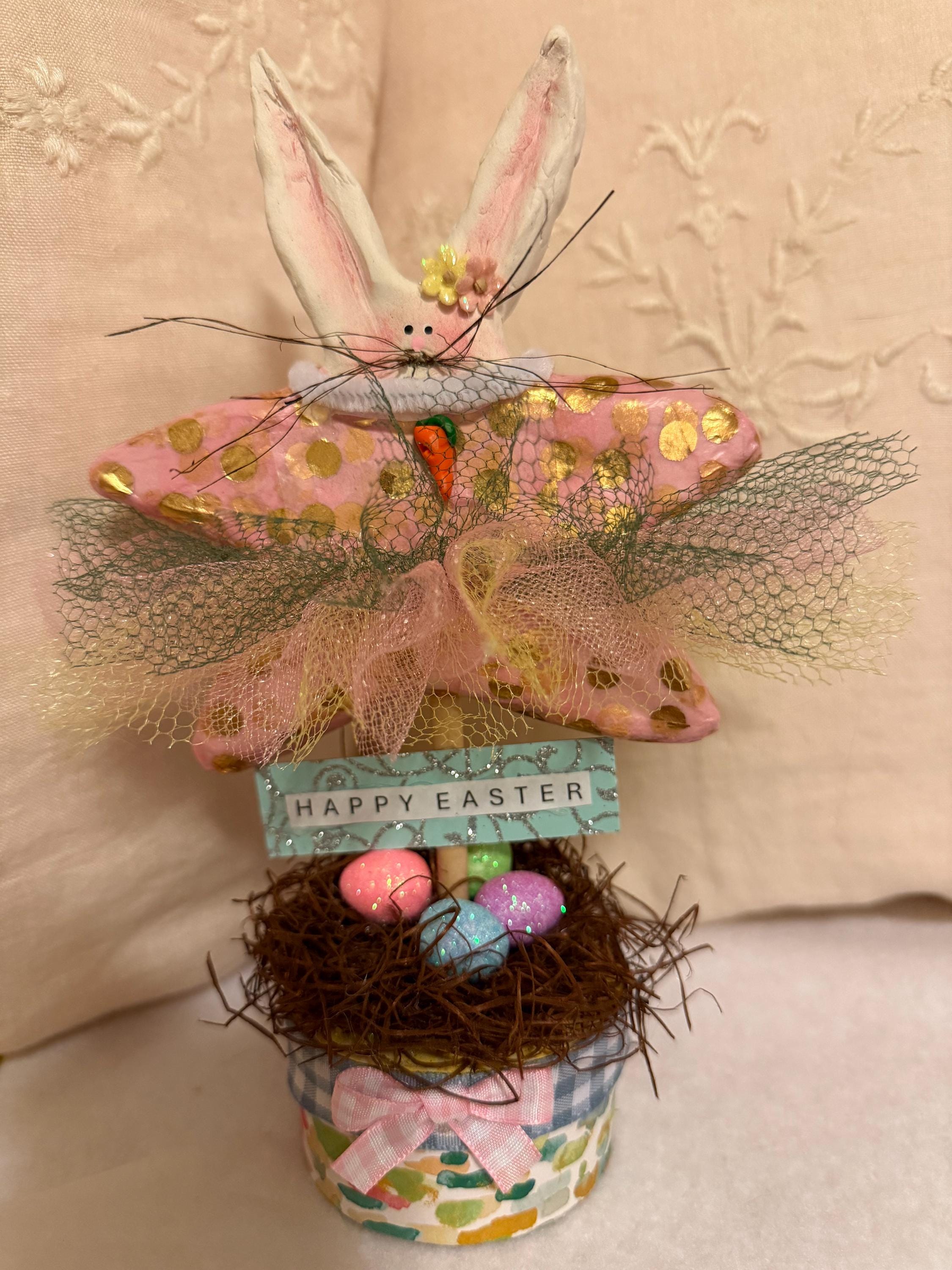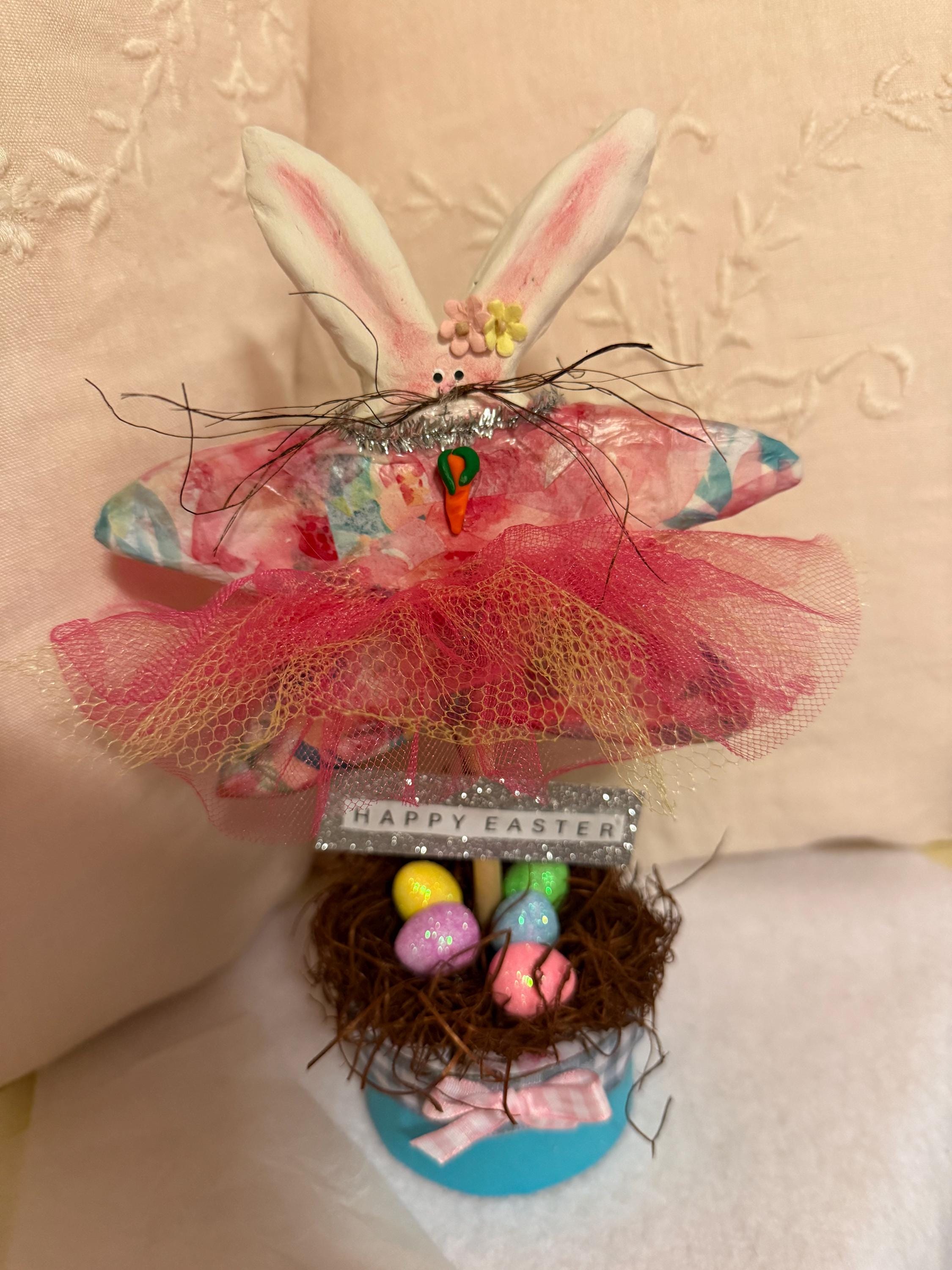 Easter Rabbits with Ballerina Tulle dresses. My Rabbits are made of paper clay and decoupaged their star body. They stand on a decorated paper mache base. They measure 9"tall and 6" wide.