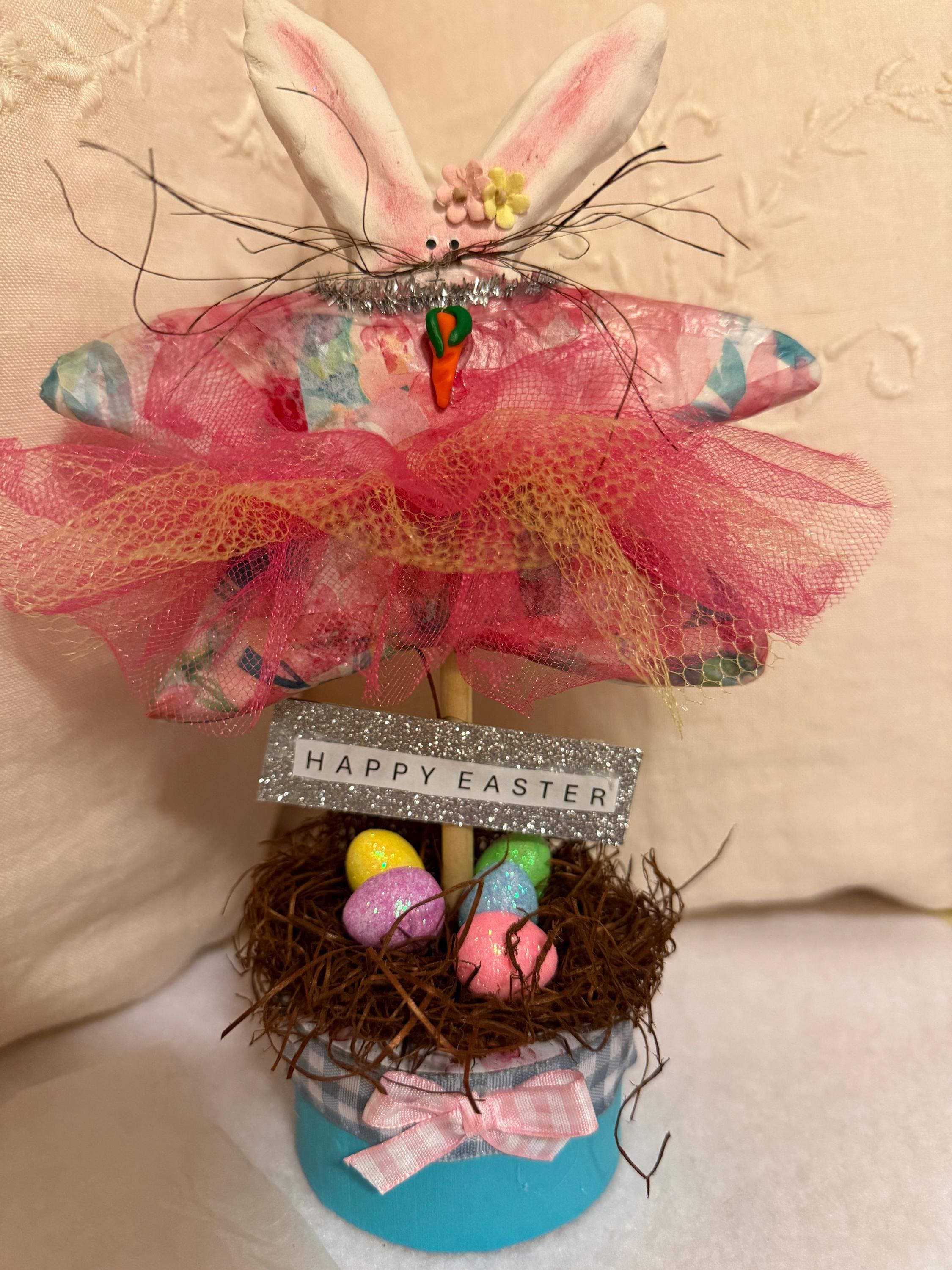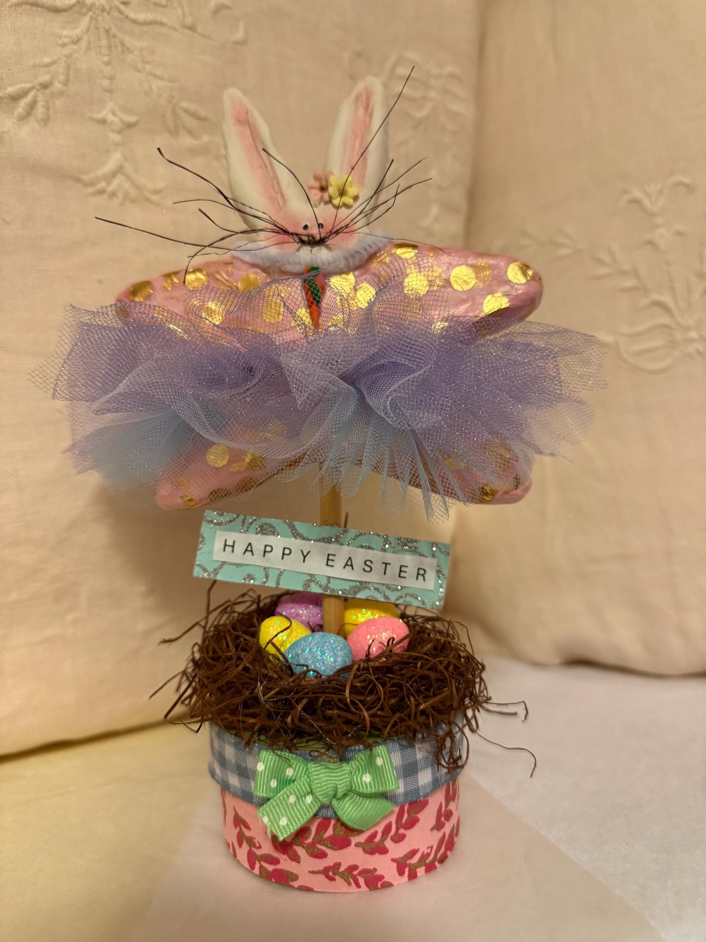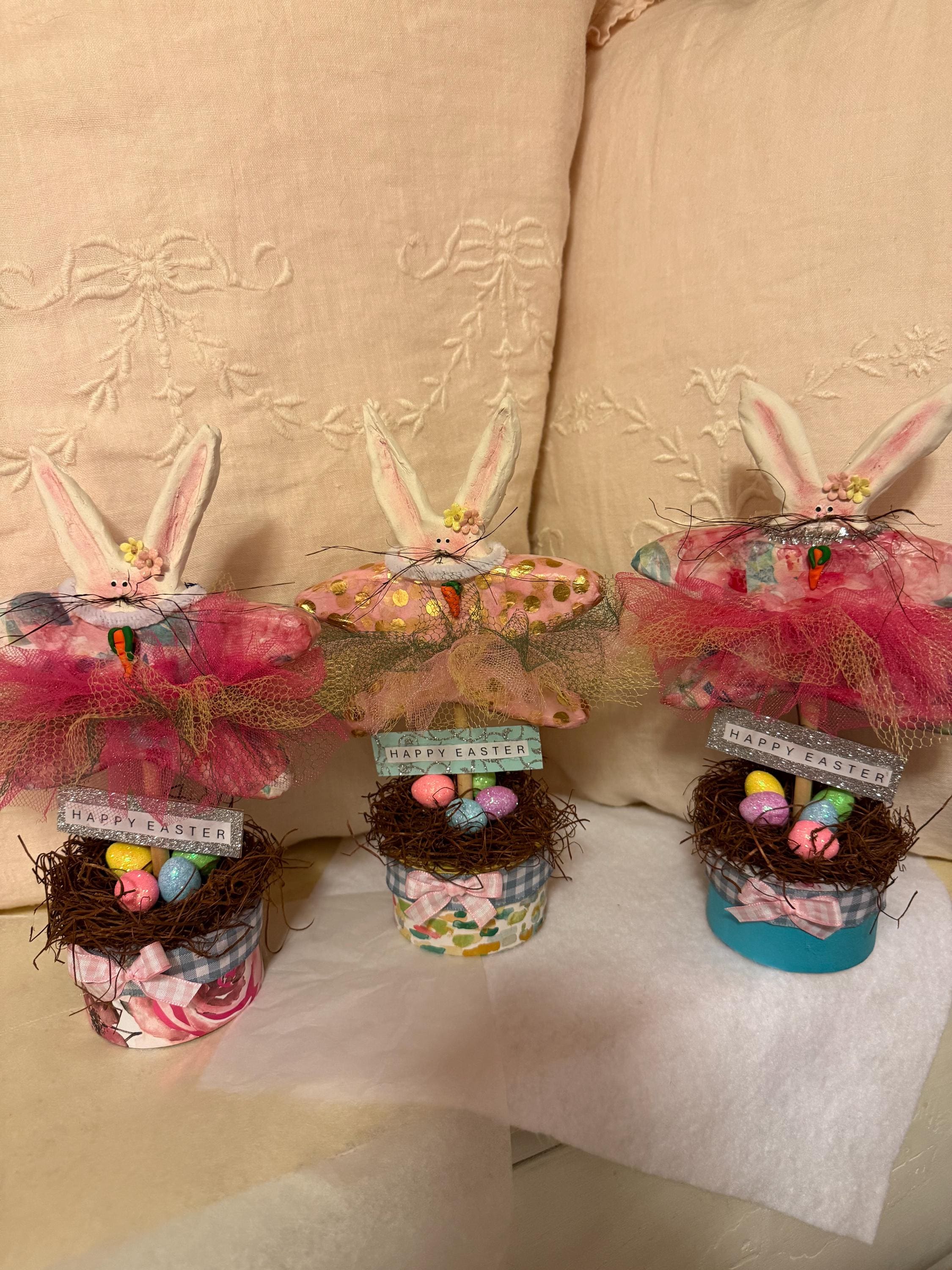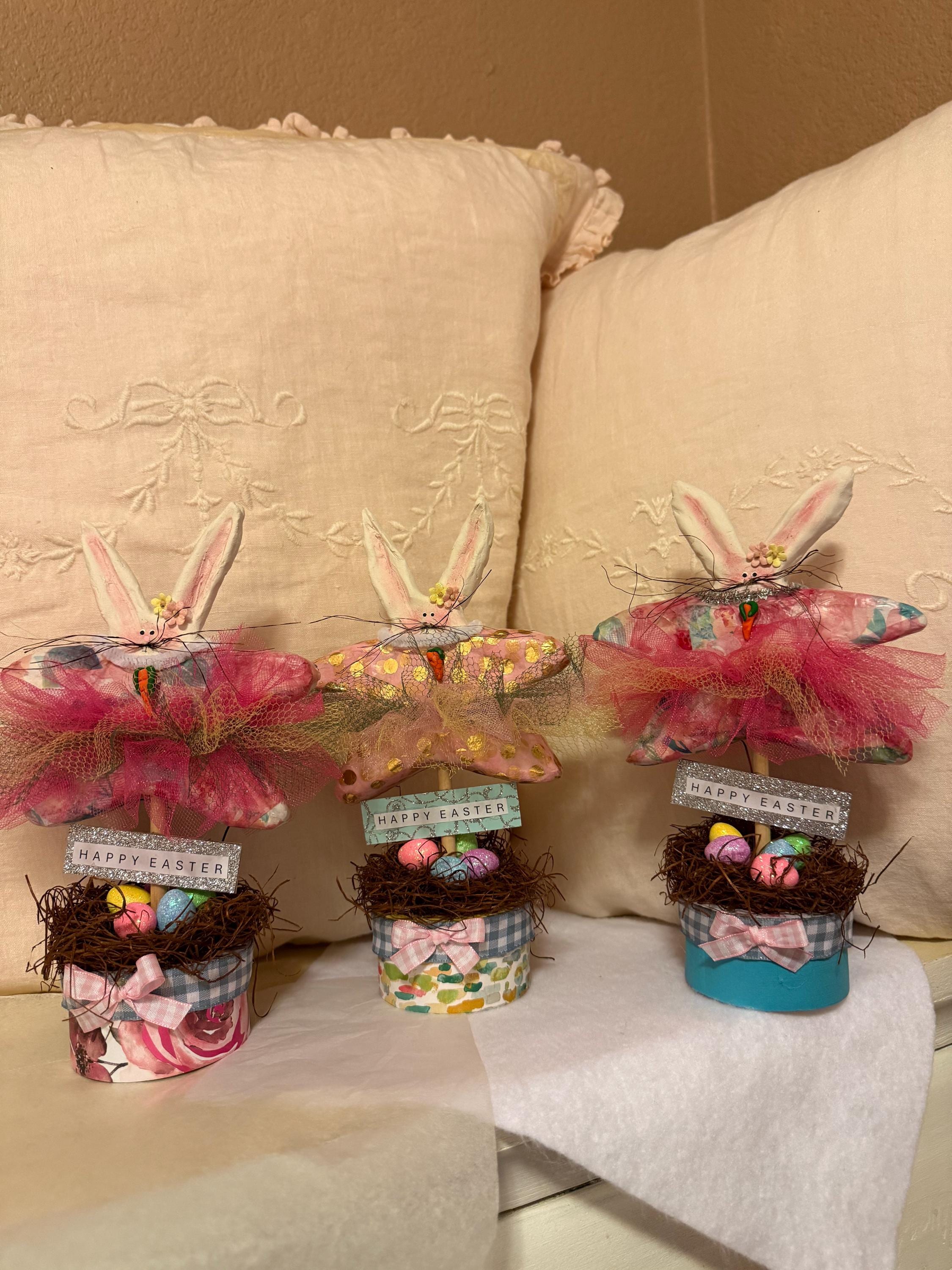Easter Rabbits with Ballerina Tulle dresses. My Rabbits are made of paper clay and decoupaged their star body. They stand on a decorated paper mache base. They measure 9"tall and 6" wide.