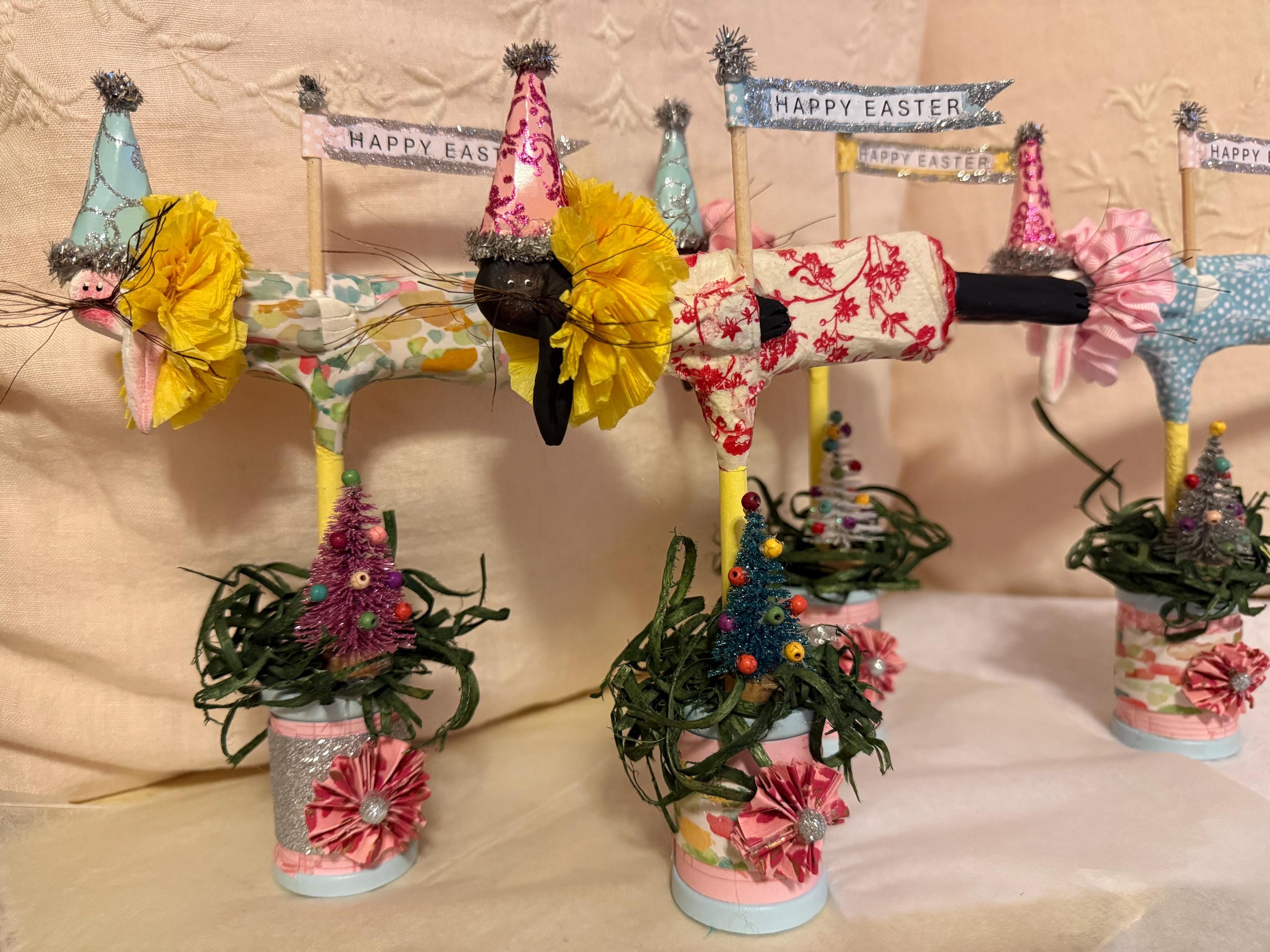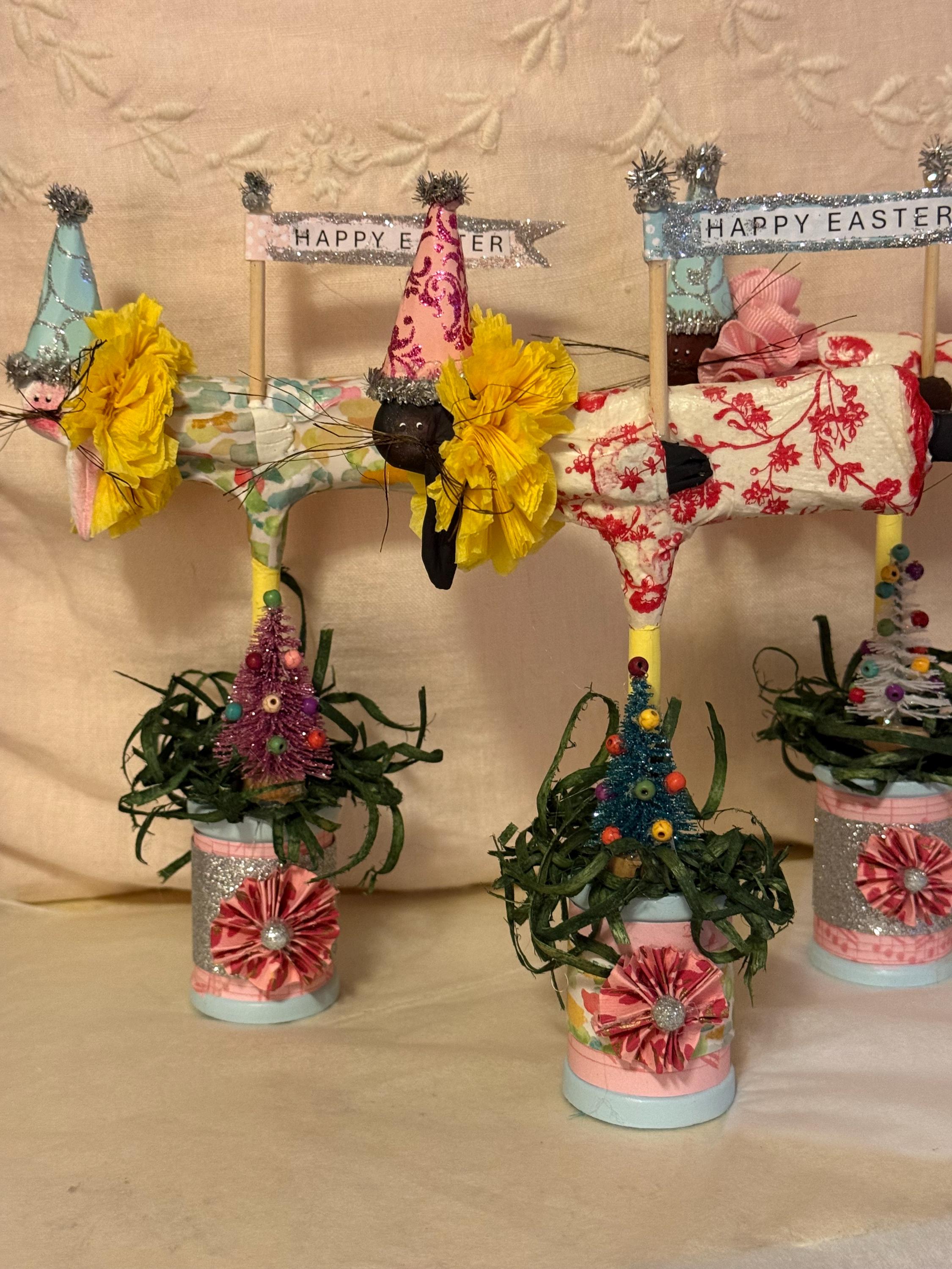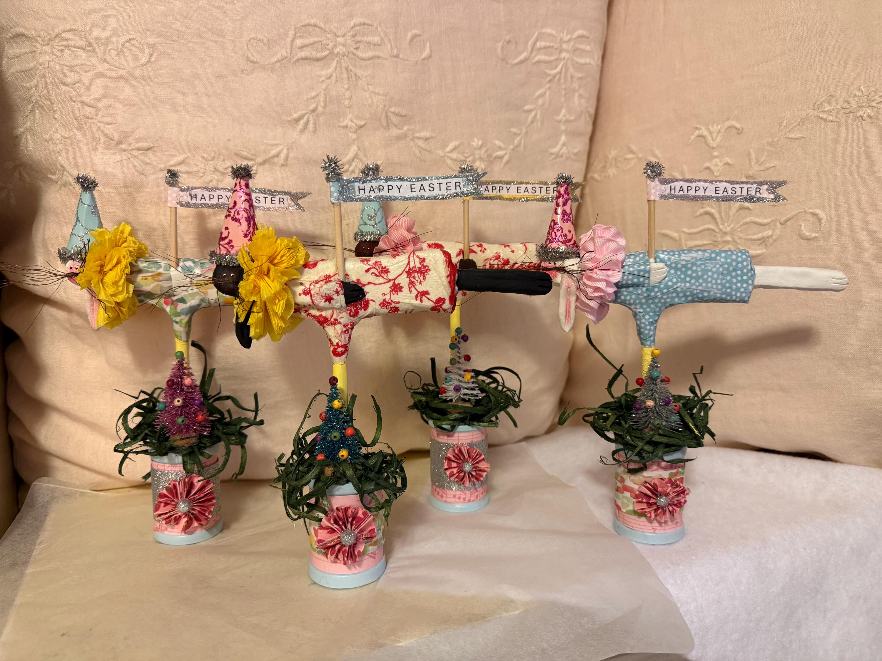 Flying bunnies celebrating Easter, they're made of paper clay and decoupaged dresses. They have a festive cone hat with an Easter Banner, they stand on a decorated wooden spool. They measure 8"tall by 7"wide, Qty 5, 3 white rabbits, 1 black and 1 brown.