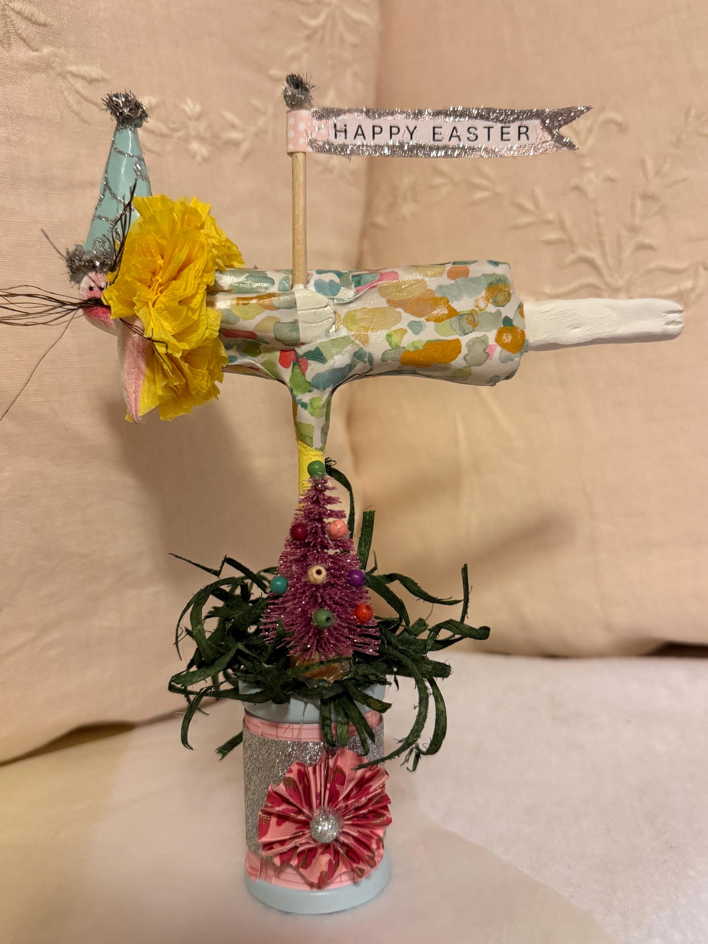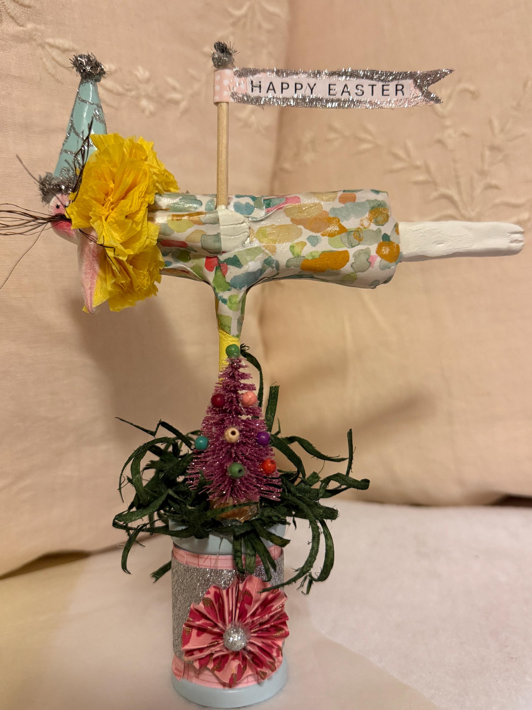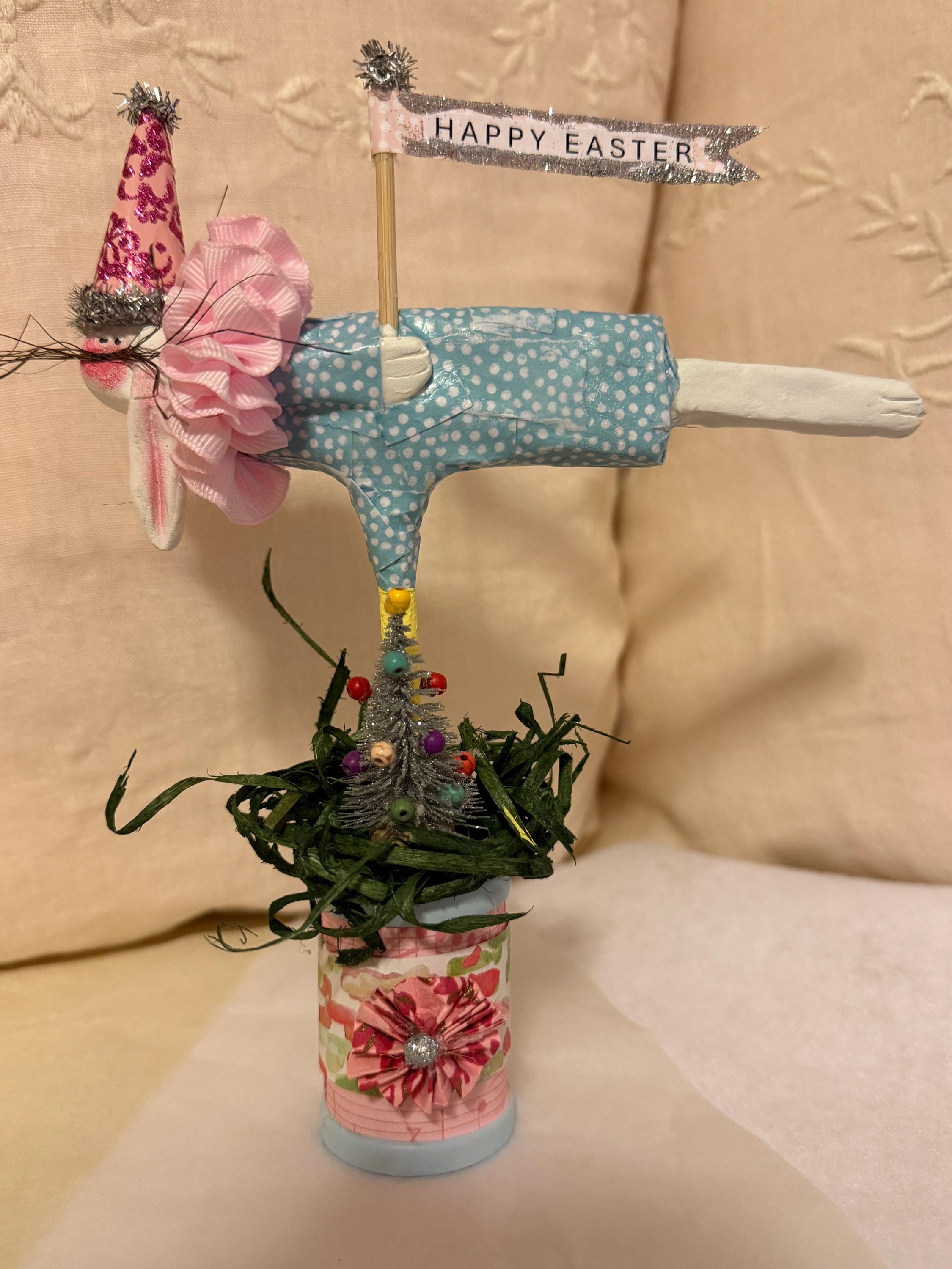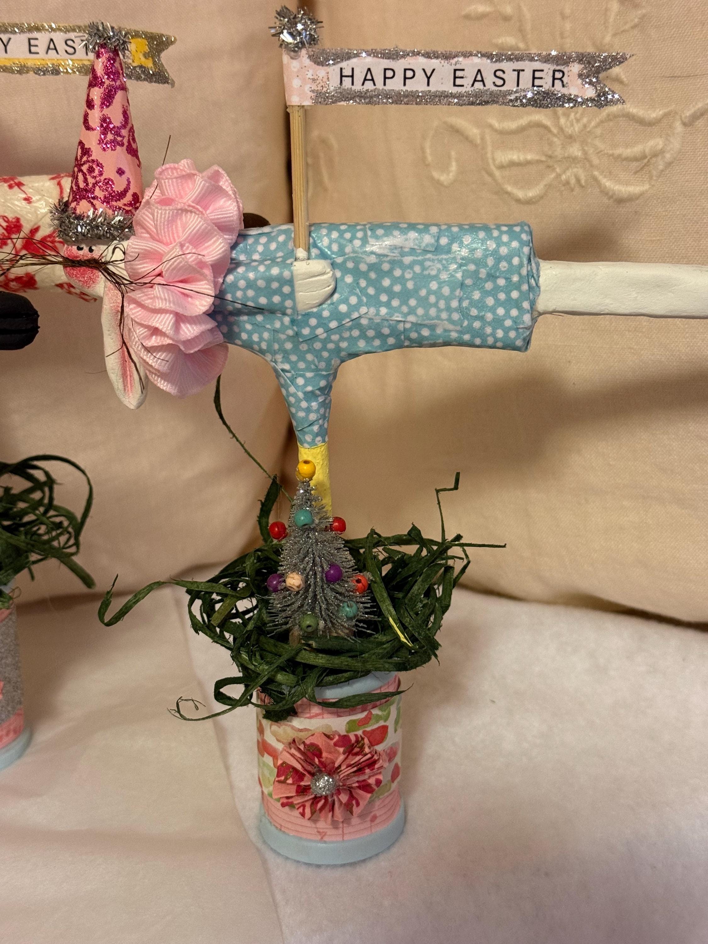 Flying bunnies celebrating Easter, they're made of paper clay and decoupaged dresses. They have a festive cone hat with an Easter Banner, they stand on a decorated wooden spool. They measure 8"tall by 7"wide, Qty 5, 3 white rabbits, 1 black and 1 brown.
