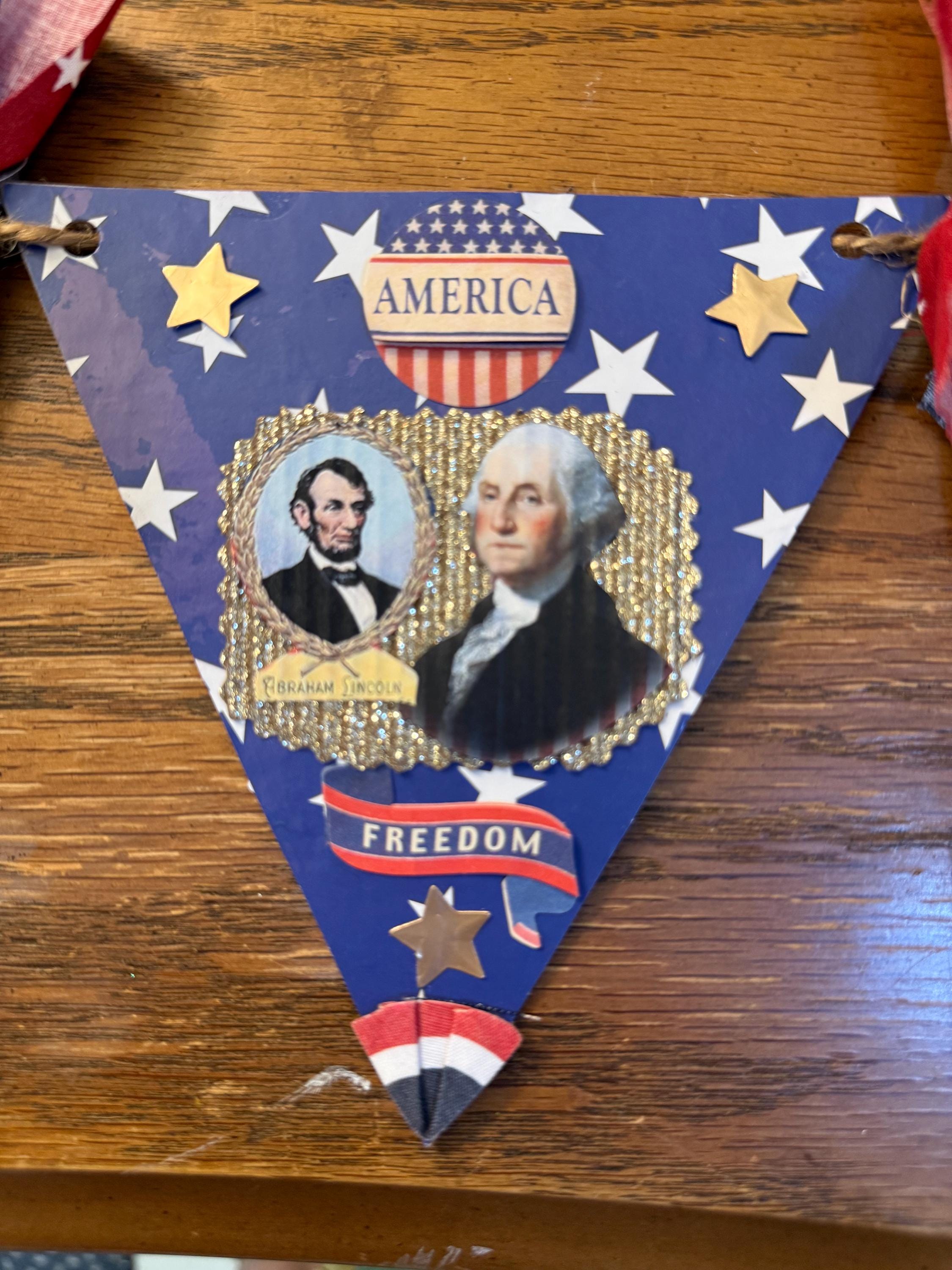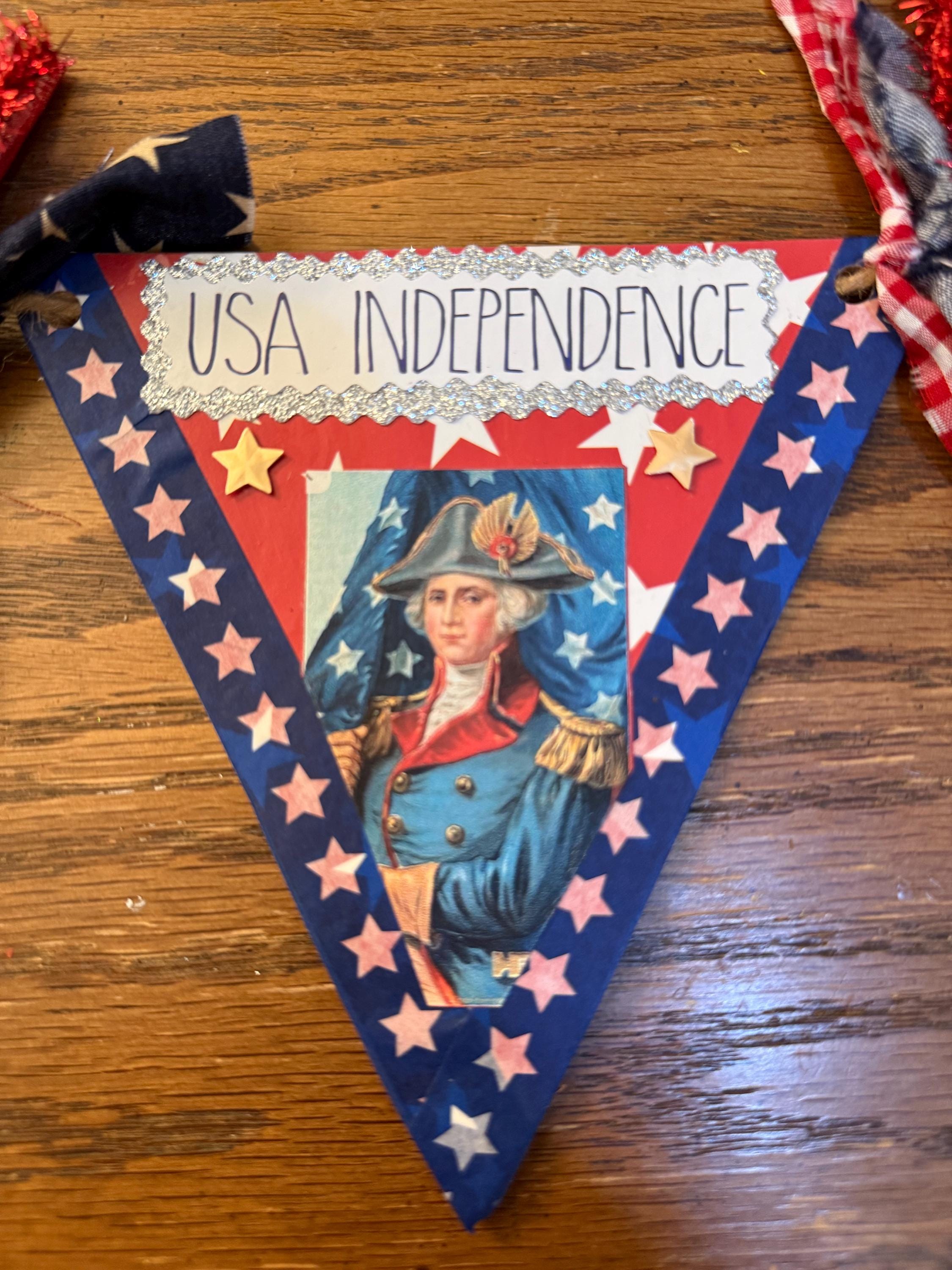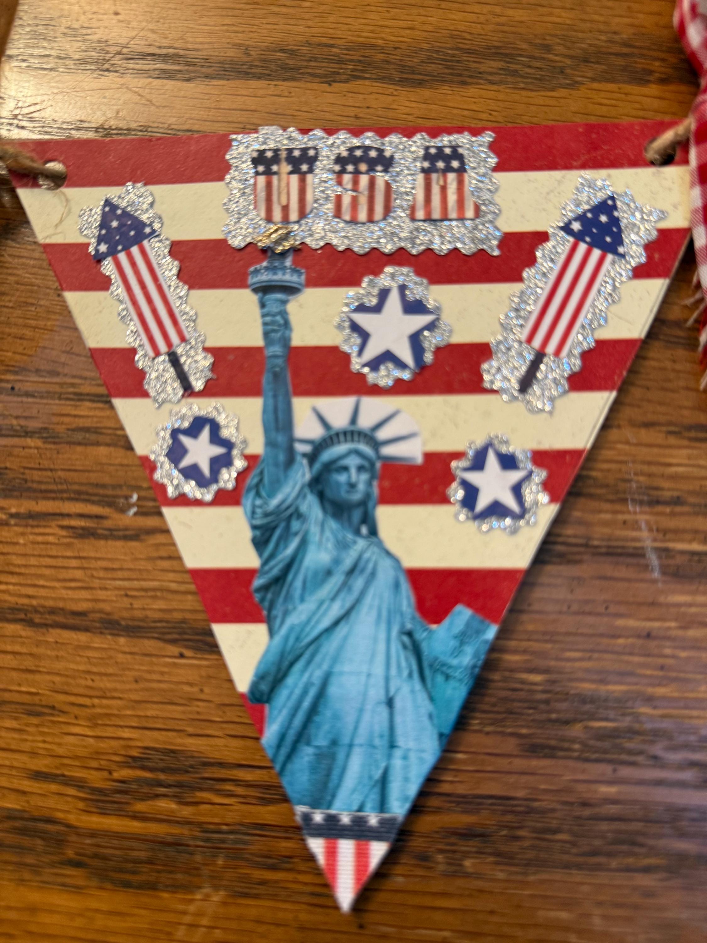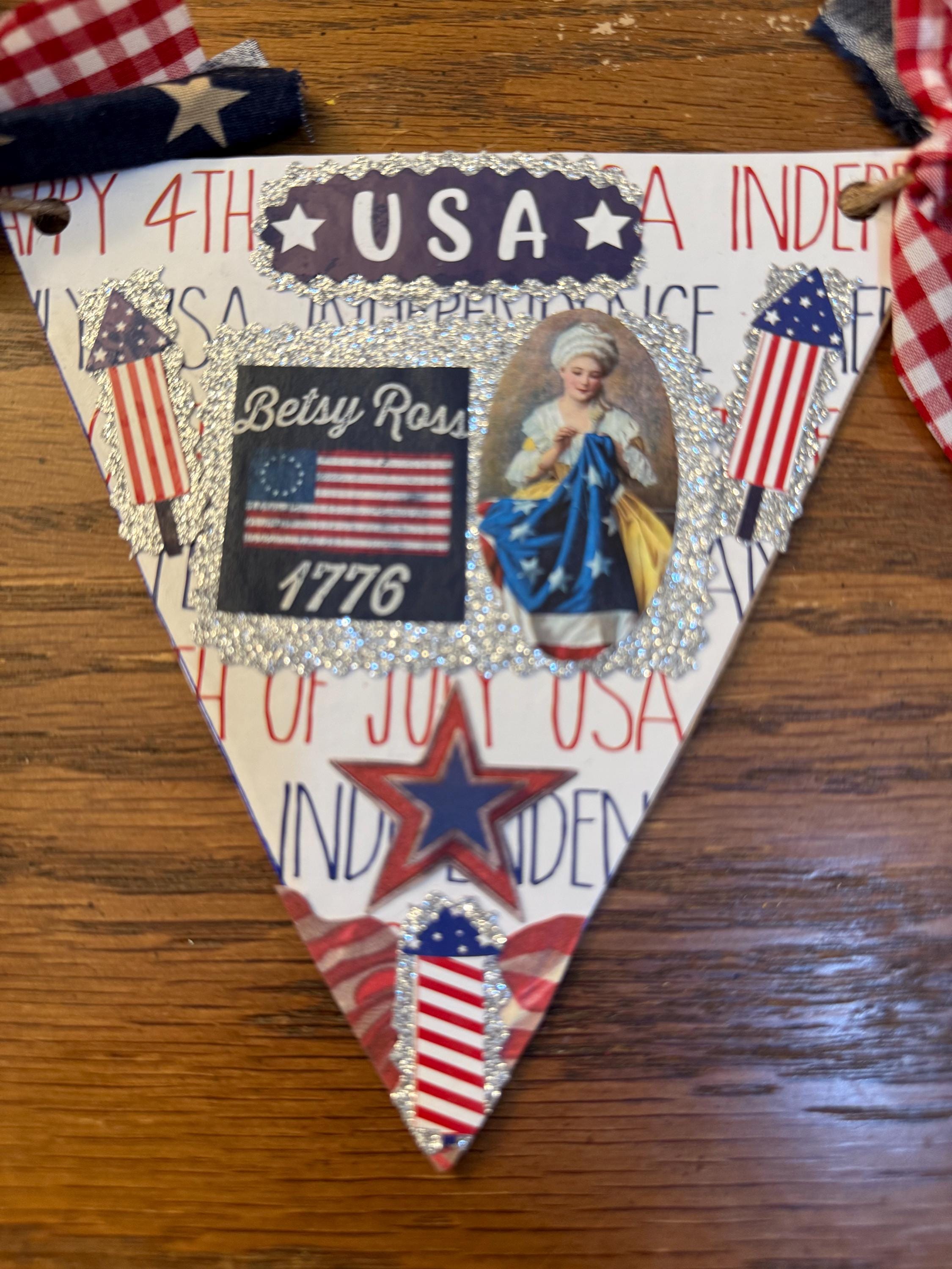 This Patriotic Swag is a digital pattern in color you get 6 pennants on two pages. Simply cut out each pennant trace onto poster board cut each one. Use Modge Podge to glue image to board also use a hole puncher where indicated on image, use twine through each hole spacing out banners. Tie fabric in between banners and tie each end with a loop to hang. Designed to be very easy to put together. Quick Video in Photos.